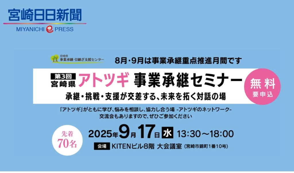 宮崎県は深刻な後継者不足で、事業の閉業が絶えません。。僕みたいな先代の跡を継いで時間をかけて仕事を引き継ぐというのは、年々少ないケースになっています。しかも後継者の平均年齢は58歳。その年代で事業を承継するも後継がおらず閉業、なんて流れができております。