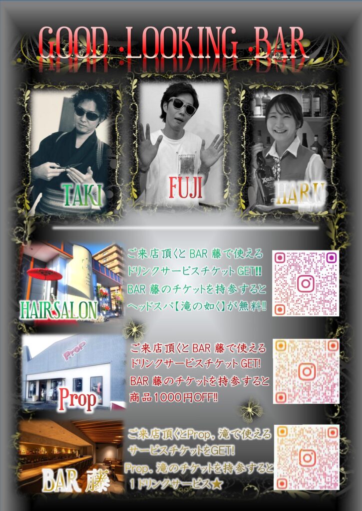 当店やProp様でグッドルッキングになったメンズの皆様、BAR藤様で最高の夜をお過ごしくださいませ!開催期間は【10月いっぱい】で、チケットの有効期間は【11月16日】までとさせて頂きます★